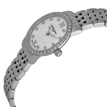 Stainless steel case with a stainless steel bracelet. Fixed stainless steel set with diamonds bezel. White guilloche-engraved dial with silver-tone spade-shaped hands and diamond hour markers. Roman numerals mark the 6 and 12 o'clock positions. Dial Type: Analog. Frederique Constant calibre FC-200 quartz movement. Scratch resistant sapphire crystal. Pull / push crown. Solid case back. Round case shape. Case size: 25 mm. Ccase thickness: 5.32 mm. Band width: 14 mm. Fold over clasp. Water resistant at 30 meters / 100 feet. Functions: hour, minute. Additional Info: withstands rain and splashes of water, but not showering or submersion. Dress watch style. Watch label: Swiss Made. Frederique Constant Stainless Steel Slim Line Diamond Ladies Watch 200WHDSD6B.