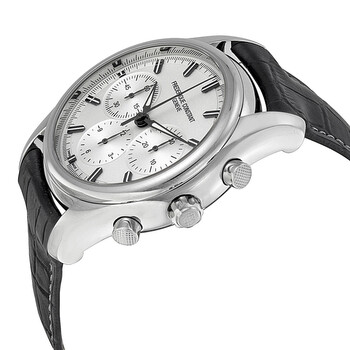 Silver-tone stainless steel case with a black leather strap. Fixed silver-tone stainless steel bezel. Silver dial with luminous grey alpha-style shape hands and index hour markers. Minute markers around the outer rim. Dial Type: Analog. Luminescent hands and markers. Chronograph - three sub-dials displaying: 60 second, 30 minute and 12 hour. Frederique Constant Calibre FC-396 automatic movement with a 46-hour power reserve. Scratch resistant convex sapphire crystal. Screw down crown. Transparent case back. Round case shape, case size: 43 mm, case thickness: 14.5 mm. Band width: 23 mm. Deployment with push button release clasp. Water resistant at 100 meters / 330 feet. Functions: chronograph, hour, minute, second. Casual watch style. Watch label: Swiss Made. Item Variations: FC 396S6B6, FC.396S6B6, FC396S6B6. Frederique Constant Vintage Rally Chronograph Automatic Silver Dial Men's Watch FC-396S6B6.