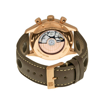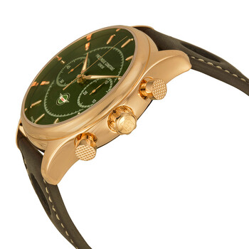 Rose gold-tone stainless steel case with a brown leather strap. Fixed rose gold-tone bezel. Dark Green dial with rose gold-tone hands and index hour markers. Minute markers around an inner ring. Dial Type: Analog. Luminescent hands and markers. Chronograph - two sub-dials displaying: 60 seconds, 30 minute. Frederique Constant calibre FC-397 automatic movement with a 46-hour power reserve. Scratch resistant sapphire crystal. Screw down crown. Skeleton case back. Case size: 42 mm. Case thickness: 15 mm. Round case shape. Band width: 21 mm. Tang clasp. Water resistant at 50 meters / 165 feet. Functions: chronograph, hour, minute, second. Additional Info: limited edition 2888 pieces. Luxury watch style. Watch label: Swiss Made. Item Variations: FC 397HDG5B4, FC.397HDG5B4, FC397HDG5B4. Frederique Constant Vintage Rally Healey Chronograph Automatic Men's Watch FC-397HDG5B4.