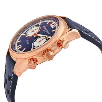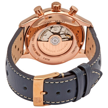 Rose gold PVD stainless steel case with a navy racing leather strap. Fixed rose gold PVD bezel. Navy dial with luminous rose gold PVD alpha-style hands and index hour markers. Arabic numerals appear at the 6 and 12 o'clock positions. Arabic numeral minute markers (at 5 minute intervals). Minute markers around the outer rim. Dial Type: Analog. Luminescent hands and markers. Chronograph - two silver sub-dials displaying: 60 second and 30 minute. Frederique Constant calibre FC-397 automatic movement, containing 27 Jewels, bitting at 28800 vph, and has a power reserve of approximately 46 hours. Scratch resistant sapphire crystal. Pull / push crown. Transparent case back. Round case shape. Case size: 42 mm. Case thickness: 15 mm. Band width: 21 mm. Tang clasp. Water resistant at 50 meters / 165 feet. Functions: chronograph, hour, minute, second. Additional Info: limited-edition piece of 2,888. Vintage Rally Healey Series. Casual watch style. Watch label: Swiss Made. Frederique Constant Vintage Rally Healey Chronograph Automatic Navy Dial Men's Watch FC-397HN5B4.