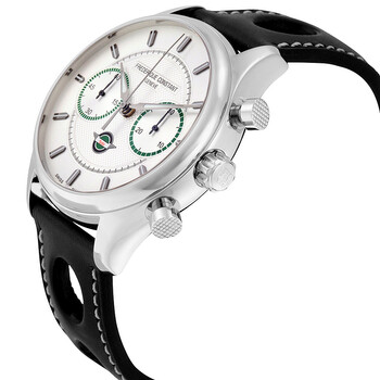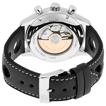 Stainless steel case with a black leather strap. Fixed stainless steel bezel. Silver dial with luminous grey hands and index hour markers. Minute markers around the outer rim. Dial Type: Analog. Luminescent hands and markers. Chronograph - two sub-dials displaying: 60 second and 30 minute. Automatic movement with a 46 hour power reserve. Scratch resistant sapphire crystal. Pull / push crown. Transparent case back. Case diameter: 42 mm. Case thickness: 15 mm. Round case shape. Band width: 21 mm. Band length: 8 inches. Tang clasp. Water resistant at 50 meters / 165 feet. Functions: chronograph, hour, minute, second. Sport watch style. Watch label: Swiss Made. Item Variations: FC 397HS5B6, FC.397HS5B6, FC397HS5B6. Frederique Constant Vintage Rally Healey Chronograph Automatic Silver Dial Men's Watch FC-397HS5B6.