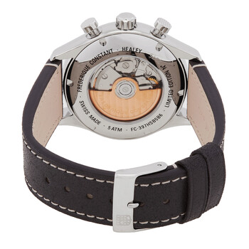 Silver-tone stainless steel case with a black leather strap. Fixed silver-tone stainless steel bezel. White dial with silver-tone hands and index-Arabic numeral hour markers. Arabic numeral marker appears at the 6 and 12 o'clock positions. Minute markers around the outer rim. Dial Type: Analog. Luminescent hands and markers. Chronograph - two sub-dials displaying: 60 second and 30 minute. Frederique Constant Calibre FC-397 Automatic movement, containing 27 Jewels, bitting at 28800 vph, and has a power reserve of approximately 46 hours. Scratch resistant sapphire crystal. Pull / push crown. Transparent case back. Round case shape, case size: 42 mm, case thickness: 15 mm. Band width: 20 mm. Buckle clasp. Water resistant at 50 meters / 165 feet. Functions: chronograph, hour, minute, second. Vintage Rally Healey Series. Sport watch style. Watch label: Swiss Made. Frederique Constant Vintage Rally Healey Chronograph Automatic White Dial Men's Watch FC-397HSB5B6.