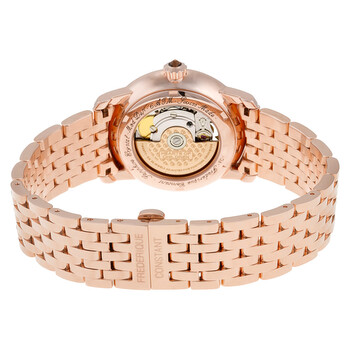 Rose gold-tone stainless steel case and bracelet. Fixed rose gold-tone bezel set with diamonds. Mother of pearl dial with rose gold-tone hands and diamond hour markers. A Roman numeral appears at the 12 o'clock position. Dial Type: Analog. Automatic movement. Scratch resistant sapphire crystal. Skeleton case back. Case diameter: 34.00 mm. Case thickness: 9.9 mm. Round case shape. Band width: 20 mm. Band length: 8 inches. Deployment clasp. Water resistant at 50 meters / 165 feet. Functions: hour, minute, second. Luxury watch style. Watch label: Swiss Made. Item Variations: FC 310WHF2PD4B3, FC.310WHF2PD4B3, FC310WHF2PD4B3. Frederique Constant World Heart Federation Mother of Pearl Diamond Ladies Watch FC-310WHF2PD4B3.