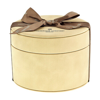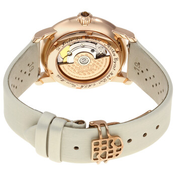 18k rose gold-plated stainless steel case with a white leather strap (with red backing). Fixed rose gold-plated bezel set with diamonds. Mother of pearl dial with skeletal display, rose gold-tone hands and diamond hour markers. Roman numeral marks the 6 o'clock position. Dial Type: Analog. Automatic movement with a 38-hour power reserve. Scratch resistant sapphire crystal. Skeleton case back. Case diameter: 34 mm. Case thickness: 9 mm. Round case shape. Hook clasp. Water resistant at 60 meters / 2000 feet. Dress watch style. Frederique Constant World Heart Mother of Pearl Dial Rose Gold-plated Ladies Watch FC-310WHF2PD4.