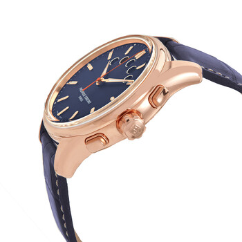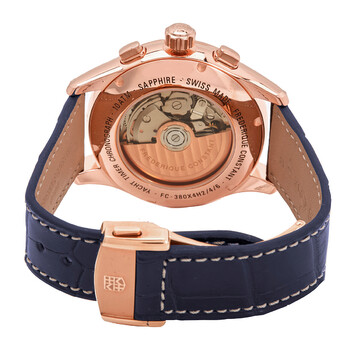 Rose gold-plated stainless steel case with a navy blue (alligator) leather strap. Fixed rose gold-plated bezel. Navy blue dial with rose gold-tone hands and index hour markers. Minute markers around the outer rim. Dial Type: Analog. Luminescent markers. Frederique Constant calibre FC-380 automatic movement with a 48-hour power reserve. Scratch resistant sapphire crystal. Pull / push crown. Transparent case back. Round case shape. Case size: 42 mm. Case thickness: 14 mm. Band width: 20 mm. Fold over clasp with a push button release. Water resistant at 100 meters / 330 feet. Functions: hour, minute, second. Dress watch style. Watch label: Swiss Made. Frederique Constant Yacht Timer Automatic Men's Watch FC-380NT4H4.