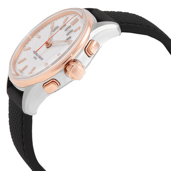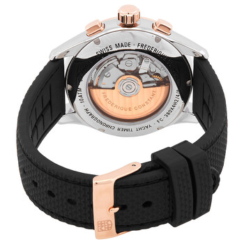 Rose gold-tone stainless steel case with a black rubber strap. Fixed rose gold-tone stainless steel bezel. Silver (regatta countdown) dial with rose gold-tone hands and index hour markers. Minute markers around the outer rim. Dial Type: Analog. Luminescent hands and markers. Caliber FC-380 automatic movement. Scratch resistant sapphire crystal. Transparent case back. Round case shape, case size: 42 mm, case thickness: 14 mm. Band width: 20 mm. Water resistant at 100 meters / 330 feet. Functions: hour, minute, second. Yacht Timer Series. Luxury watch style. Watch label: Swiss Made. Frederique Constant Yacht Timer Automatic Silver Dial Men's Watch FC-380VT4H2.
