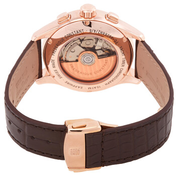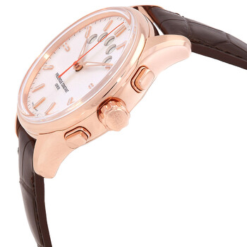 Rose gold-tone stainless steel case with a brown alligator leather strap. Fixed bezel. Silver dial with rose gold-tone hands and index hour markers. Dial Type: Analog. FC-380 automatic movement. Scratch resistant sapphire crystal. Transparent see through case back. Round case shape, case size: 42 mm. Water resistant at 100 meters / 330 feet. Functions: hour, minute, second. Yacht Timer Series. Dress watch style. Watch label: Swiss Made. Frederique Constant Yacht Timer Automatic Silver Dial Men's Watch FC-380VT4H4.