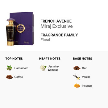 Miraj Exclusive opens with a captivating burst of cardamom and coffee, offering a warm and spicy introduction that immediately awakens the senses. As the fragrance unfolds, the heart reveals a lush bouquet of jasmine sambac, adding a soft, floral sweetness that feels both radiant and romantic. Finally, the scent settles into a rich base of oud, vanilla, and incense, creating a deep, sensual finish that lingers long after application.