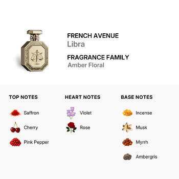 French Avenue, a distinguished Middle Eastern fragrance house based in the United Arab Emirates, brings its artistry to life in Libra. Belonging to the Amber Floral family, this Eau de Parfum opens with vibrant top notes of saffron, cherry, and pink pepper that create an instantly captivating aura. As the scent unfolds, delicate heart notes of violet and rose bring a soft, romantic essence, while the base lingers with smoky incense, sensual musk, exotic myrrh, and deep ambergris for a mysterious, long-lasting finish.
