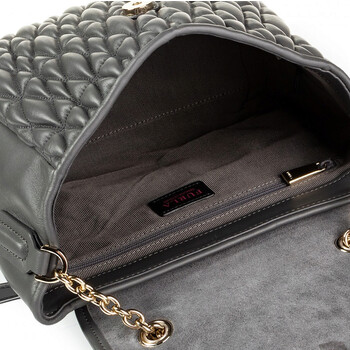 Furla Ladies Backpack. SKU: BPICBYO72Q000ZG1R. Barcode: 8050560409340. Color: Asphalte. Size: 25 cm x 23 cm x 10 cm. Furla Ladies Pin Cometa S Leather Backpack In Asphalte. Crafted from leather, this backpack features 1 main internal compartment, 1 wall zip pocket, a gold-toned metal hardware, chain top handle, adjustable shoulder straps and 1 rear patch pocket.