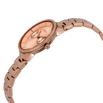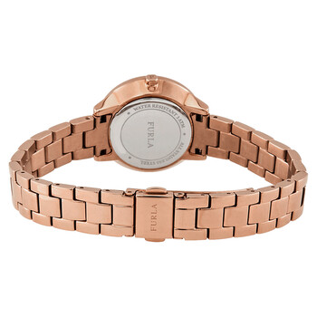 Rose gold PVD stainless steel case and bracelet. Fixed rose gold PVD bezel. Rose dial with rose gold-tone hands and index hour markers. Minute markers around the outer rim. Dial Type: Analog. Caliber Y120EY quartz movement. Scratch resistant mineral crystal. Pull / push crown. Solid case back. Round case shape. Case size: 31 mm. Case thickness: 7.57 mm. Band width: 18 mm. Deployment clasp with a push button release. Water resistant at 50 meters / 165 feet. Functions: hour, minute. Casual watch style. Watch label: Japan Movt. Furla Metropolis Rose Gold Dial Ladies Watch R4253102518.