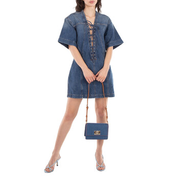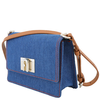 Furla Ladies Mini Bag. SKU: WB01237BX15422676S1007. Closure Type: Flap. Color: Blue. Size: 20cm x 15cm x 7cm. Furla Mini Denim Logo Clasp Shoulder Bag. This bag is crafted from light denim. It features a sleek rectangular shape with a stable base, an adjustable leather shoulder strap, and a main compartment secured by a flap with an Arch logo clasp. The design is accented with contrast stitching and leather trim.