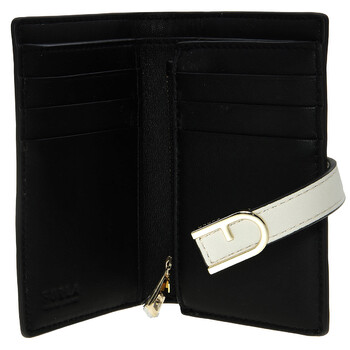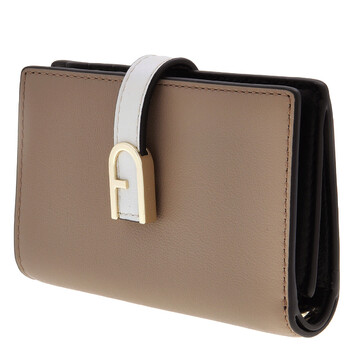 Furla Ladies Wallets. SKU: WP00401BX27252837S1007. Color: Brown. Size: W: 12.7cm x H: 8.5cm x D:2cm. Furla S Compact Leather Wallet. Wallet is made of soft nappa leather with a grained finish. It features a book-like design with a contrasting tongue closure, finished with the Arco logo. The wallet's interior is well-organized, including a zip pocket, a compartment for banknotes, six card slots, and two flat pockets for documents. It also has a snap button closure for security. 100% Leather.