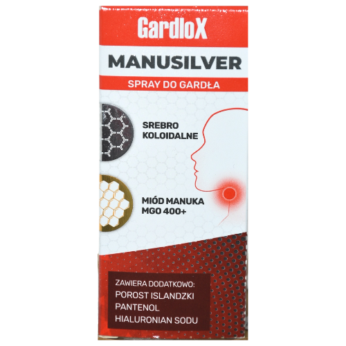 გარდლოქსი მანუსილვერის სპრეი არის ერთადერთი პროდუქტი ბაზარზე, რომელიც შეიცავს სერტიფიცირებული მანუკას თაფლს MGO400+ და ნანო კოლოიდური ვერცხლის უნიკალურ კომბინაციას. ახასიათებს ანტიბაქტერიული, ანტივირუსული, სოკოს საწინააღმდეგო, დამატენიანებელი, რეგენერაციული, დამცავი და სუნთქვის გასაადვილებელი მოქმედება.ემადგენლობა: ნანოკოლოიდური ვერცხლი, მანუკას თაფლი MGO 400+, ისლანდიური ლიქენი, ნატრიუმის ჰიალურონატი, პანთენოლი, გლიცერინი, პოლიპროპილენგლიკოლი, მიხაკის ზეთი, პიტნის ზეთი, ევკალიპტის ზეთი, ბეგქონდარას ზეთი, შავი მოცხარის არომატი, სუკრალოზა, პოლისორბატი 20, პოლიჰექსანიდი, წყალი.