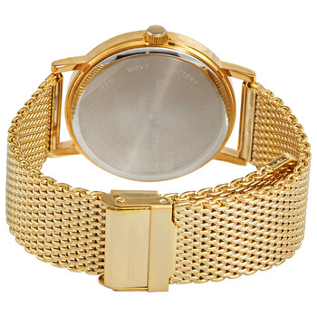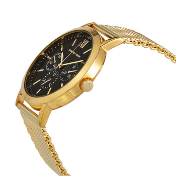 Gold-tone stainless steel case with a gold-tone alloy mesh bracelet. Fixed gold-tone alloy bezel. Black dial with gold-tone hands and index hour markers. A Roman numeral appears at the 12 o'clock position. Minute markers around the outer rim. Dial Type: Analog. Chronograph - three sub-dials displaying: 60 second, 30 minute and 12 hour. Quartz movement. Scratch resistant mineral crystal. Pull / push crown. Solid case back. Round case shape. Case size: 42 mm. Band width: 22 mm. Fold over slip through clasp. Water resistant at 30 meters / 100 feet. Functions: chronograph, hour, minute, second. Dress watch style. Watch label: Japan Movt. Geoffrey Beene Chronograph Quartz Black Dial Men's Watch GB8048GDBK.