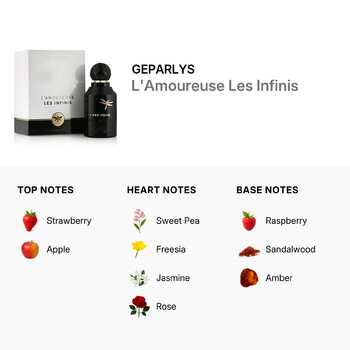 Step into a world of elegance and charm with L'Amoureuse Les Infinis by Geparlys. This luxurious ladies' Eau de Parfum captures the essence of romance and sophistication in every spray. Designed for the modern woman who embraces her femininity, this 2.8 oz fragrance opens with a burst of juicy strawberry and crisp apple, creating a fresh and inviting introduction.