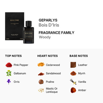 The base notes leave a lasting impression with the luxurious blend of smooth leather, exotic myrrh, soft vanilla, golden amber, and sensual musk. These deep, long-lasting notes wrap the skin in a sophisticated finish that lingers throughout the day, making Bois D'Iris a perfect signature scent for any occasion.