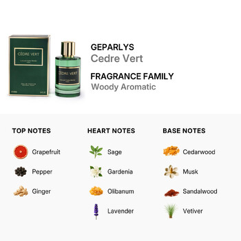 At the top, Cedre Vert opens with a vibrant burst of grapefruit, blended with spicy pepper and warm ginger. This lively introduction awakens the senses and sets the tone for the fragrance's dynamic personality. As it settles, a heart of sage, gardenia, lavender, and olibanum reveals a refined, herbal freshness with a subtle floral twist, creating a balanced and modern scent profile.