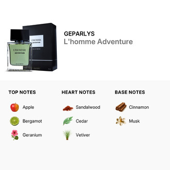 Discover the bold essence of Geparlys L'homme Adventure Eau de Parfum Spray for Men, a daring fragrance crafted for those who embrace life’s journey with confidence. Launched in 2015 by the prestigious French design house Geparlys, this 3.0 oz scent captures the spirit of adventure in every spray.