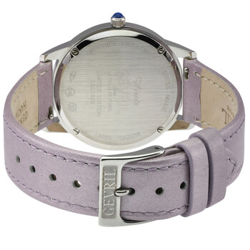 Silver-tone stainless steel case with a purple leather strap. Fixed silver-tone stainless steel bezel. Mother of pearl dial with silver-tone hands and diamond hour markers. Minute markers around the outer rim. Dial Type: Analog. Ronda Caliber 762 quartz movement. Scratch resistant sapphire crystal. Pull / push crown. Solid case back. Round case shape, case size: 36 mm, case thickness: 7.5 mm. Band width: 18 mm. Buckle clasp. Water resistant at 50 meters / 165 feet. Functions: hour, minute. Additional Info: 12 cultured diamonds, crown with blue cabochon stone. Airolo Series. Luxury watch style. Watch label: Swiss Made. Gevril Airolo Diamond Mother of Pearl Dial Ladies Watch 13041.