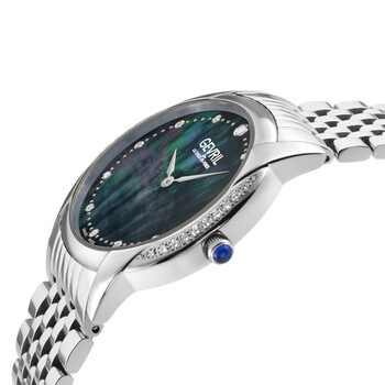 Silver-tone stainless steel case and bracelet. Fixed silver-tone bezel with diamond set. Mother of pearl dial with silver-tone hands and diamond hour markers. Minute markers around the outer rim. Dial Type: Analog. Quartz movement. Scratch resistant sapphire crystal. Pull / push crown. Solid case back. Round case shape, case size: 36 mm, case thickness: 7.5 mm. Band width: 18 mm, band length: 7.5 inches. Buckle clasp. Water resistant at 50 meters / 165 feet. Functions: hour, minute. Additional Info: 46 cultured diamonds, crown with blue cabochon stone. Airolo Series. Luxury watch style. Watch label: Swiss Made. Gevril Airolo Diamond Mother of Pearl Dial Ladies Watch 13147B.