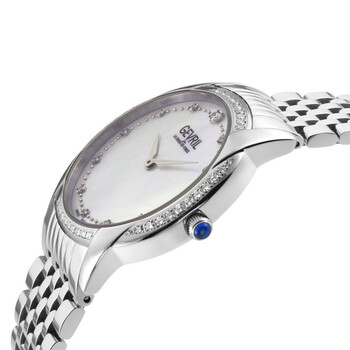 Silver-tone stainless steel case and bracelet. Fixed silver-tone bezel with diamond set stainless steel. Mother of pearl dial with silver-tone hands and diamond hour markers. Dial Type: Analog. Ronda Caliber 762 quartz movement. Scratch resistant sapphire crystal. Pull / push crown. Solid case back. Round case shape, case size: 36 mm, case thickness: 7.5 mm. Band width: 18 mm. Buckle clasp. Water resistant at 50 meters / 165 feet. Functions: hour, minute. Additional Info: 68 cultured diamonds, crown with blue cabochon stone. Airolo Series. Luxury watch style. Watch label: Swiss Made. Gevril Airolo Diamond Mother of Pearl Dial Ladies Watch 13241B.