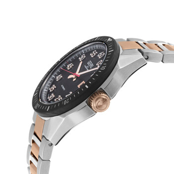 Silver-tone stainless steel case with a two-tone (silver-tone and rose gold-tone) stainless steel bracelet. Fixed black stainless steel bezel. Black dial with rose gold-tone hands and Arabic numeral hour markers. Minute markers around the outer rim. Dial Type: Analog. Luminescent hands and markers. Date display at the 3 o'clock position. Sellita Caliber SW220 automatic movement. Scratch resistant sapphire crystal. Screw down crown. Transparent see through case back. Round case shape, case size: 42 mm, case thickness: 12 mm. Band width: 18 mm. Deployment with push button release clasp. Water resistant at 100 meters / 330 feet. Functions: date, hour, minute, second. Additional Info: forged carbon bezel. Ascari Series. Luxury watch style. Watch label: Swiss Made. Gevril Ascari Automatic Black Dial Men's Watch 48303B.