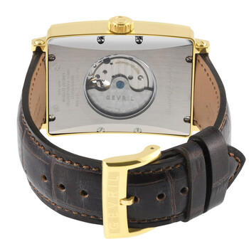 Yellow gold-tone stainless steel case with a brown genuine leather strap. Fixed yellow gold-tone stainless steel bezel. White dial with yellow gold-tone hands and Arabic numeral hour markers. Minute scale around the inner rim. Dial Type: Analog. Date display at the 6 o'clock position. Sellita Caliber SW200 Automatic movement, containing 26 Jewels, bitting at 28800 vph, and has a power reserve of approximately 38 hours. Scratch resistant sapphire crystal. Pull / push crown. Transparent see through case back. Rectangle case shape, case size: 44 mm, case thickness: 14 mm. Band width: 23 mm. Buckle clasp. Water resistant at 50 meters / 165 feet. Functions: date, hour, minute, second. Avenue Of Americas Series. Luxury watch style. Watch label: Swiss Made. Gevril Avenue of Americas Automatic White Dial Men's Watch 15100-6.