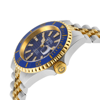 Stainless steel case with a two-tone (silver-tone and yellow gold-tone) stainless steel bracelet. Uni-directional rotating gold-tone bezel with an inlaid blue ring. Blue dial with luminous yellow gold-tone hands and index hour markers. Minute markers around the outer rim. Dial Type: Analog. Luminescent hands and markers. Date display at the 3 o'clock position. Sellita caliber SW200 automatic movement, containing 26 Jewels, bitting at 28800 vph, and has a power reserve of approximately 38 hours. Scratch resistant sapphire crystal. Screw down crown. Transparent case back. Round case shape. Case size: 43 mm. Case thickness: 13 mm. Band width: 18 mm. Deployment clasp with a push button release. Water resistant at 200 meters / 660 feet. Functions: date, hour, minute, second. Additional Info: magnified date window, ceramic bezel. Chambers Series. Luxury watch style. Watch label: Swiss Made. Gevril Chambers Automatic Blue Dial Men's Watch 42603.