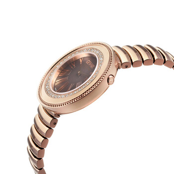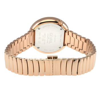 Rose gold-tone stainless steel case and bracelet. Fixed rose gold-tone stainless steel bezel. Mother of pearl dial with rose gold-tone hands and Roman numeral hour markers. Dial Type: Analog. Ronda Caliber 769 quartz movement. Scratch resistant sapphire crystal. Pull / push crown. Solid case back. Round case shape, case size: 36 mm, case thickness: 7.5 mm. Band width: 16 mm. Deployment with push button release clasp. Water resistant at 50 meters / 165 feet. Functions: hour, minute. Gandria Series. Luxury watch style. Watch label: Swiss Made. Gevril Gandria Mother of Pearl Dial Ladies Watch 12152B.