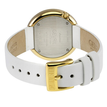 Yellow gold-tone stainless steel case with a white leather strap. Fixed yellow gold-tone stainless steel bezel. Mother of pearl dial with yellow gold-tone hands and Roman numeral hour markers. Dial Type: Analog. Ronda Caliber 762 quartz movement. Scratch resistant sapphire crystal. Pull / push crown. Solid case back. Round case shape, case size: 36 mm, case thickness: 7.5 mm. Band width: 16 mm. Buckle clasp. Water resistant at 50 meters / 165 feet. Functions: hour, minute. Additional Info: 108 cultured diamonds on outer case. Gandria Series. Luxury watch style. Watch label: Swiss Made. Gevril Gandria Mother of Pearl Dial Ladies Watch 12221.