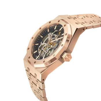 Rose gold-tone stainless steel case and bracelet. Fixed rose gold-tone stainless steel bezel. Black dial with rose gold-tone hands and index hour markers. Minute markers around the outer rim. Dial Type: Analog. Luminescent hands and markers. PO24 Skeleton automatic movement. Scratch resistant sapphire crystal. Pull / push crown. Transparent case back. Round case shape, case size: 41 mm, case thickness: 12 mm. Band width: 24 mm, band length: 8.5 inches. Deployment with push button release clasp. Water resistant at 100 meters / 330 feet. Functions: hour, minute, second. Gotham Series. Luxury watch style. Watch label: Swiss Made. Gevril Gotham Automatic Black Dial Men's Watch 49422B.