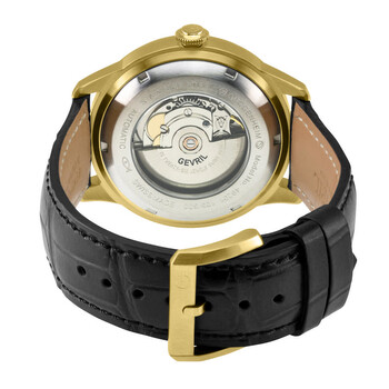 Yellow gold-tone stainless steel case with a black leather strap. Fixed yellow gold-tone stainless steel bezel. Black dial with yellow gold-tone hands and index hour markers. Minute markers around the outer rim. Dial Type: Analog. Luminescent hands. Date display between 8 and 11 o'clock position. Sellita Caliber SW200-1 Automatic movement, containing 26 Jewels, bitting at 28800 vph, and has a power reserve of approximately 38 hours. Scratch resistant sapphire crystal. Screw down crown. Transparent case back. Round case shape, case size: 44 mm, case thickness: 11 mm. Band width: 18 mm. Buckle clasp. Water resistant at 50 meters / 165 feet. Functions: date, hour, minute, second. Guggenheim Series. Luxury watch style. Watch label: Swiss Made. Gevril Guggenheim Automatic Black Dial Men's Watch 49203.
