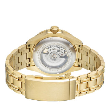 Yellow gold-tone stainless steel case and bracelet. Uni-directional rotating yellow gold-tone bezel with an inlaid black ring. Black dial with luminous yellow gold-tone hands and index hour markers. Minute markers around the outer rim. Dial Type: Analog. Luminescent hands and markers. Date display at the 3 o'clock position. Sellita SW200 automatic movement. Scratch resistant sapphire crystal. Screw down crown. Transparent case back. Round case shape. Case size: 43 mm. Case thickness: 14 mm. Band width: 20 mm. Deployment clasp with a push button release. Water resistant at 300 meters / 1000 feet. Functions: date, hour, minute, second. Additional Info: divers, screw down helium release valve. Hudson Yards Series. Luxury watch style. Watch label: Swiss Made. Gevril Hudson Yards Automatic Black Dial Men's Watch 48804.
