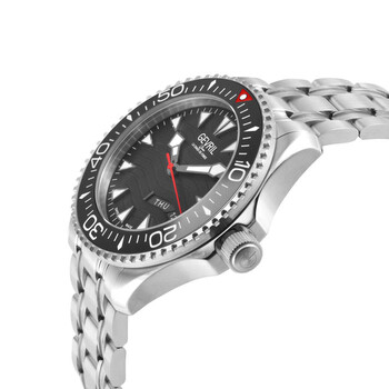 Silver-tone stainless steel case and bracelet. Uni-directional rotating black ceramic bezel. Black dial with silver-tone hands and index hour markers. Minute markers around the outer rim. Dial Type: Analog. Luminescent hands and markers. Day / date. Sellita Caliber SW220-1 automatic movement. Scratch resistant sapphire crystal. Screw down crown. Transparent case back. Round case shape, case size: 43 mm, case thickness: 13 mm. Band width: 19 mm. Deployment with push button release clasp. Water resistant at 300 meters / 1000 feet. Functions: date, day, hour, minute, second. Additional Info: dive extension deployment buckle. Hudson Yards Series. Luxury watch style. Watch label: Swiss Made. Gevril Hudson Yards Automatic Black Dial Men's Watch 48830B.