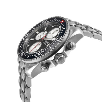 Silver-tone stainless steel case and bracelet. Uni-directional rotating black stainless steel bezel. Black dial with silver-tone hands and index hour markers. Minute markers around the outer rim. Dial Type: Analog. Luminescent hands and markers. Date display at the 3 o'clock position. Chronograph - three sub-dials displaying: 60 second, 30 minute and 12 hour. Sellita Caliber SW500 Automatic movement, containing 25 Jewels, bitting at 28800 vph, and has a power reserve of approximately 44 hours. Scratch resistant sapphire crystal. Screw down crown. Transparent case back. Round case shape, case size: 43 mm, case thickness: 17 mm. Band width: 20 mm. Deployment with push button release clasp. Water resistant at 300 meters / 1000 feet. Functions: chronograph, date, day, hour, minute, small second. Additional Info: helium release valve, chronograph. Hudson Yards Chronograph Series. Luxury watch style. Watch label: Swiss Made. Gevril Hudson Yards Chronograph Automatic Black Dial Men's Watch 48814B.
