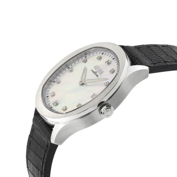 Silver-tone stainless steel case with a black leather strap. Fixed silver-tone stainless steel bezel. Mother of pearl dial with silver-tone hands and diamond hour markers. Minute markers around the outer rim. Dial Type: Analog. Ronda Caliber 762 quartz movement. Scratch resistant sapphire crystal. Pull / push crown. Solid case back. Cushion case shape, case size: 36 mm, case thickness: 7.5 mm. Band width: 18 mm. Buckle clasp. Water resistant at 50 meters / 165 feet. Functions: hour, minute. Additional Info: 12 cultured diamonds. Morcote Series. Luxury watch style. Watch label: Swiss Made. Gevril Morcote Diamond Mother of Pearl Dial Ladies Watch 10041.
