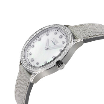 Silver-tone stainless steel case with a silver-tone genuine leather strap. Fixed bezel with diamond set. Mother of pearl dial with silver-tone hands and diamond hour markers. Minute markers around the outer rim. Dial Type: Analog. Quartz movement. Scratch resistant sapphire crystal. Pull / push crown. Solid case back. Cushion case shape, case size: 36 mm, case thickness: 7.5 mm. Band width: 18 mm, band length: 7.5 inches. Buckle clasp. Water resistant at 50 meters / 165 feet. Functions: hour, minute. Additional Info: 92 cultured diamonds. Morcote Series. Luxury watch style. Watch label: Swiss Made. Gevril Morcote Quartz Diamond Ladies Watch 10241.