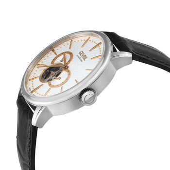 Silver-tone stainless steel case with a black leather strap. Fixed silver-tone stainless steel bezel. White dial with rose gold-tone hands and index hour markers. Minute markers around the outer rim. Dial Type: Analog. M0579G automatic movement. Scratch resistant sapphire crystal. Pull / push crown. Solid case back. Round case shape, case size: 42 mm, case thickness: 12 mm. Band width: 20 mm. Buckle clasp. Water resistant at 50 meters / 165 feet. Functions: hour, minute, second. Mulberry Series. Luxury watch style. Watch label: Swiss Made. Gevril Mulberry Automatic White Dial Men's Watch 9611.