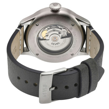 Silver-tone stainless steel case with a grey genuine leather strap. Fixed silver-tone stainless steel bezel. Grey dial with silver-tone hands and Arabic & index hour markers. Minute markers around the outer rim. Dial Type: Analog. Luminescent hands and markers. Date display at the 3 o'clock position. Sellita Caliber SW200 Automatic movement, containing 26 Jewels, bitting at 28800 vph, and has a power reserve of approximately 38 hours. Scratch resistant sapphire crystal. Pull / push crown. Transparent case back. Round case shape, case size: 44 mm, case thickness: 11.5 mm. Band width: 20 mm. Buckle clasp. Water resistant at 50 meters / 165 feet. Functions: date, hour, minute, second. Vaughn Series. Luxury watch style. Watch label: Swiss Made. Gevril Vaughn Automatic Grey Dial Men's Watch 43505.