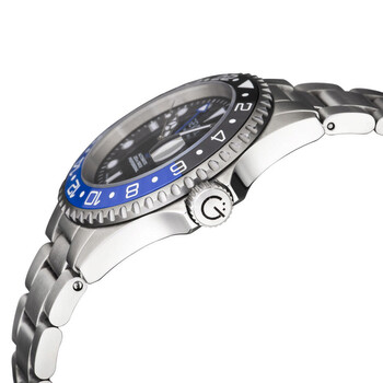 Stainless Steel with an inlaid Black and Blue Ceramic Ring showing 24 Hour Markers