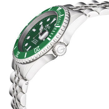 Stainless steel case with a stainless steel bracelet. Uni-directional rotating stainless steel bezel with an inlaid green ceramic ring. Green dial with luminous silver-tone hands and dot hour markers. Minute markers around the outer rim. Dial Type: Analog. Luminescent hands and markers. Date display at the 3 o'clock position. Sellita caliber SW200 automatic movement, containing 26 Jewels, bitting at 28800 vph, and has a power reserve of approximately 38 hours. Scratch resistant sapphire crystal. Screw down crown. Solid case back. Round case shape. Case size: 43 mm. Case thickness: 13 mm. Band width: 22 mm. Deployment clasp with a push button release. Water resistant at 200 meters / 660 feet. Functions: date, hour, minute, second. Additional Info: magnified date window, ceramic bezel. Wall Street Series. Luxury watch style. Watch label: Swiss Made. Gevril Wall Street Automatic Green Dial Men's Watch 4859B.