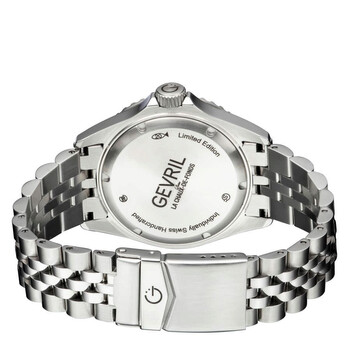 Stainless steel case with a stainless steel bracelet. Uni-directional rotating stainless steel bezel with a black and red (Coke) ceramic ring showing 24 hour markers. Black dial with luminous silver-tone Mercedes-logo and Breguet-style shape hands and dot hour markers. Minute markers around the outer rim. Dial Type: Analog. Luminescent hands and markers. Magnified date display at the 3 o'clock position. Sellita caliber SW330 automatic movement, containing 25 Jewels, bitting at 28800 vph, and has a power reserve of approximately 42 hours. Scratch resistant sapphire crystal. Screw down crown. Solid case back. Round case shape. Case size: 43 mm. Case thickness: 13 mm. Band width: 18 mm. Deployment clasp with a push button release. Water resistant at 200 meters / 660 feet. Functions: date, hour, minute, second, 24 hour. Wall Street Series. Luxury watch style. Watch label: Swiss Made. Gevril Wall Street GMT Black Dial Coke Bezel Men's Watch 4954B.