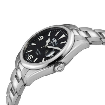 Silver-tone stainless steel case and bracelet. Fixed silver-tone stainless steel bezel. Black dial with silver-tone hands and Arabic numeral & index hour markers. Minute markers around the outer rim. Dial Type: Analog. Luminescent hands and markers. Date display at the 3 o'clock position. Sellita Caliber SW200 Automatic movement, containing 26 Jewels, bitting at 28800 vph, and has a power reserve of approximately 38 hours. Scratch resistant sapphire crystal. Screw down crown. Solid case back. Round case shape, case size: 40 mm, case thickness: 12 mm. Band width: 16 mm. Deployment with push button release clasp. Water resistant at 100 meters / 330 feet. Functions: date, hour, minute, second. Additional Info: magnified date window. West Village Series. Luxury watch style. Watch label: Swiss Made. Gevril West Village Automatic Black Dial Men's Watch 48949B.