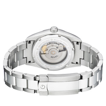 Silver-tone stainless steel case and bracelet. Fixed silver-tone stainless steel bezel. Blue dial with silver-tone hands and index hour markers. Minute markers around the outer rim. Dial Type: Analog. Luminescent hands and markers. Date display at the 3 o'clock position. Sellita Caliber SW200-1 Automatic movement, containing 26 Jewels, bitting at 28800 vph, and has a power reserve of approximately 38 hours. Scratch resistant sapphire crystal. Screw down crown. Transparent case back. Round case shape, case size: 40 mm, case thickness: 12.5 mm. Band width: 22 mm, band length: 8.5 inches. Deployment with push button release clasp. Water resistant at 100 meters / 330 feet. Functions: date, hour, minute, second. West Village Series. Luxury watch style. Watch label: Swiss Made. Gevril West Village Automatic Blue Dial Men's Watch 48907.