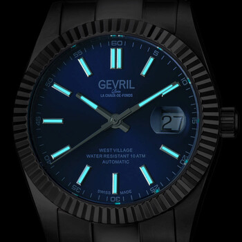 Silver-tone stainless steel case and bracelet. Fixed silver-tone stainless steel bezel. Blue dial with silver-tone hands and index hour markers. Minute markers around the outer rim. Dial Type: Analog. Luminescent hands and markers. Date display at the 3 o'clock position. Sellita Caliber SW200 Automatic movement, containing 26 Jewels, bitting at 28800 vph, and has a power reserve of approximately 38 hours. Scratch resistant sapphire crystal. Screw down crown. Transparent case back. Round case shape, case size: 40 mm, case thickness: 12.5 mm. Band width: 20 mm. Deployment with push button release clasp. Water resistant at 100 meters / 330 feet. Functions: date, hour, minute, second. Additional Info: fluted bezel , tapered bracelet, magnified date window. West Village Series. Luxury watch style. Watch label: Swiss Made. Gevril West Village Blue Dial Men's Watch 48920.