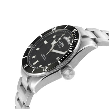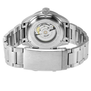 Silver-tone stainless steel case and bracelet. Uni-directional rotating black stainless steel bezel. Black dial with silver-tone hands and index hour markers. Minute markers around the outer rim. Dial Type: Analog. Luminescent hands and markers. Day / date. Calibre SW240 automatic movement. Scratch resistant sapphire crystal. Screw down crown. Transparent case back. Round case shape, case size: 43 mm, case thickness: 13 mm. Band width: 19 mm. Deployment with push button release clasp. Water resistant at 200 meters / 660 feet. Yorkville Series. Luxury watch style. Watch label: Swiss Made. Gevril Yorkville Automatic Black Dial Men's Watch 48630B.
