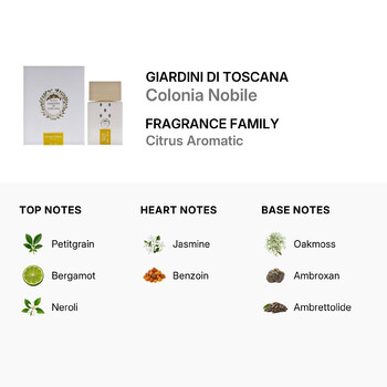 Embrace the art of fine perfumery with Giardini Di Toscana's Colonia Nobile, a scent that embodies the perfect balance of freshness, floral elegance, and earthy richness. Add this timeless fragrance to your collection today and experience the allure of Colonia Nobile.