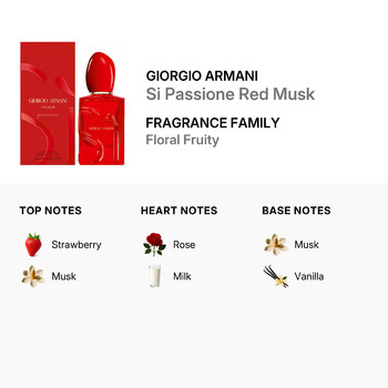 Si Passione Red Musk belongs to the Floral Fruity fragrance family, making it both vibrant and inviting. The top notes open with a juicy burst of strawberry paired with the sensual allure of musk—setting the stage for a heart that blooms with delicate rose and creamy milk. As it settles, rich base notes of velvety musk and warm vanilla leave a memorable trail that lingers beautifully on the skin.