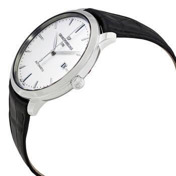 Stainless steel case with a black leather strap. Fixed stainless steel bezel. White dial with silver-tone hands and index hour markers. Minute markers around the outer rim. Dial Type: Analog. Date display at the 3 o'clock position. Girard Perregaux calibre GP03300-0030 automatic movement with a 46-hour power reserve. Scratch resistant sapphire crystal. Pull / push crown. Transparent case back. Case size: 40 mm. Round case shape. Tang clasp. Water resistant at 30 meters / 100 feet. Functions: date, hour, minute, second. Luxury watch style. Watch label: Swiss Made. Girard Perregaux 1966 Automatic Men's Watch 49555-11-131-BB60.